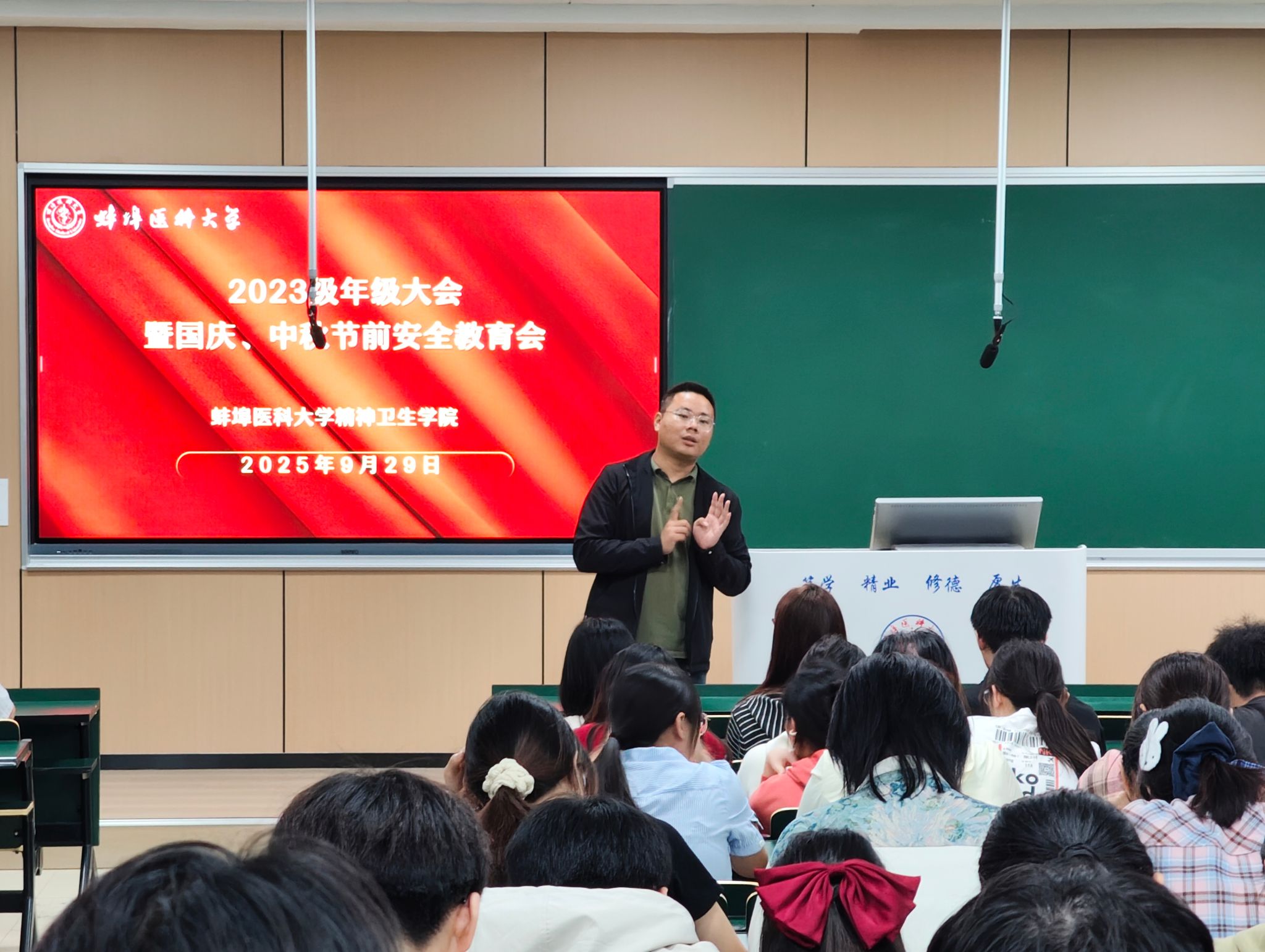 为切实做好假期学生安全教育管理工作、增强学生安全防范意识,同时持续推进学风建设、营造积极向上的育人氛围,9月29日,精神卫生学院采用线上线下相结合的方式,召开 2022 级、2023 级 “双节” 前安全教育暨学风建设主题班会,班会由辅导员郭小虎主持。