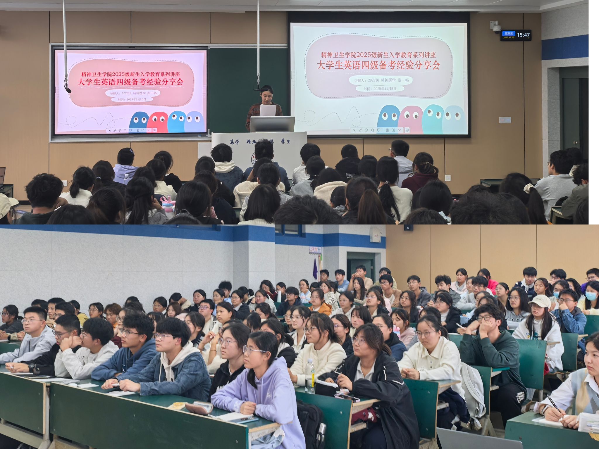 为扎实推进新生入学教育工作,引导2025级新生科学规划大学生涯、提升英语学习能力,精神卫生学院于2025年11月5日下午在理论楼306教室成功举办“大学生英语四级备考经验分享会”。本次讲座特邀2023级精神医学专业秦一畅同学担任主讲,分享她在英语学习与四级备考方面的宝贵经验。活动由2025级年级辅导员组织,全体新生积极参与。
