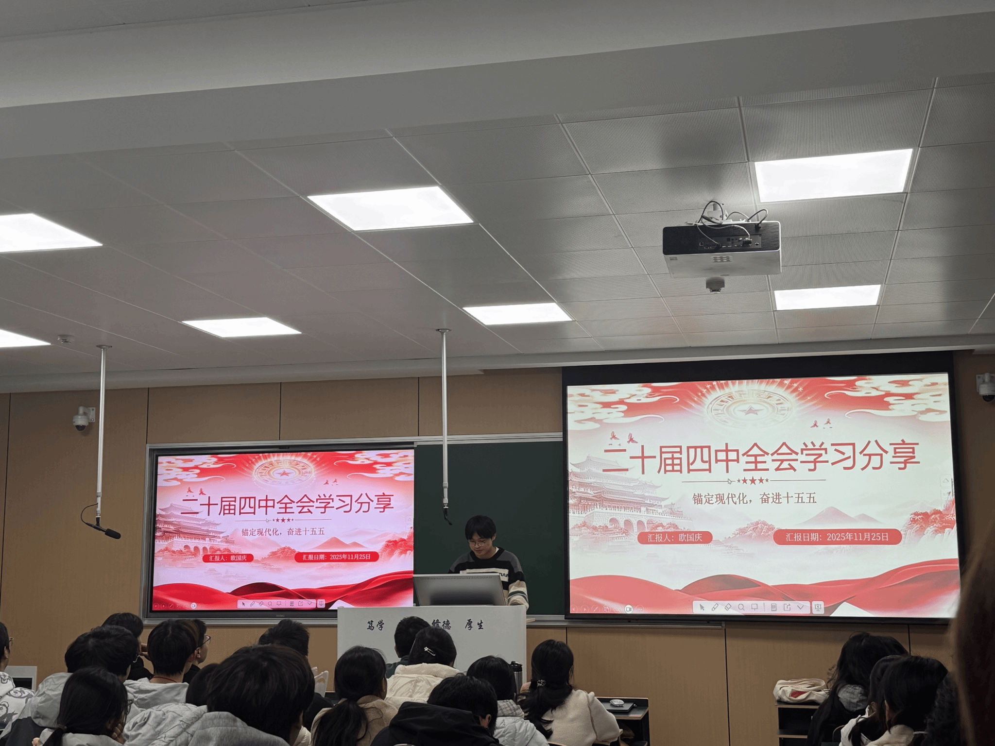随后,2024级思政委员欧国庆同学围绕“学习贯彻党的二十届四中全会精神”作主题宣讲。他结合自身学习与实践感悟,对全会精神进行了生动阐释,号召同学们将个人理想融入国家发展大局,增强时代责任感和使命感。