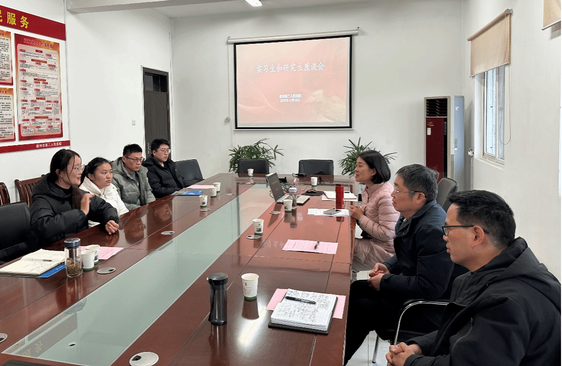 会后,张静院长专门召开研究生和实习生座谈会,亲切询问同学们的学习与生活情况,细心叮嘱临床轮转与实习期间的各项注意事项,并对医院完善的实习安排与优良的带教环境给予高度评价。张静勉励同学们珍惜实践机会,严守医院规章制度,虚心请教、勤学苦练,在真实的医疗环境中锤炼技能、提升素养,充分展现蚌埠医科大学学子的精神风貌。
