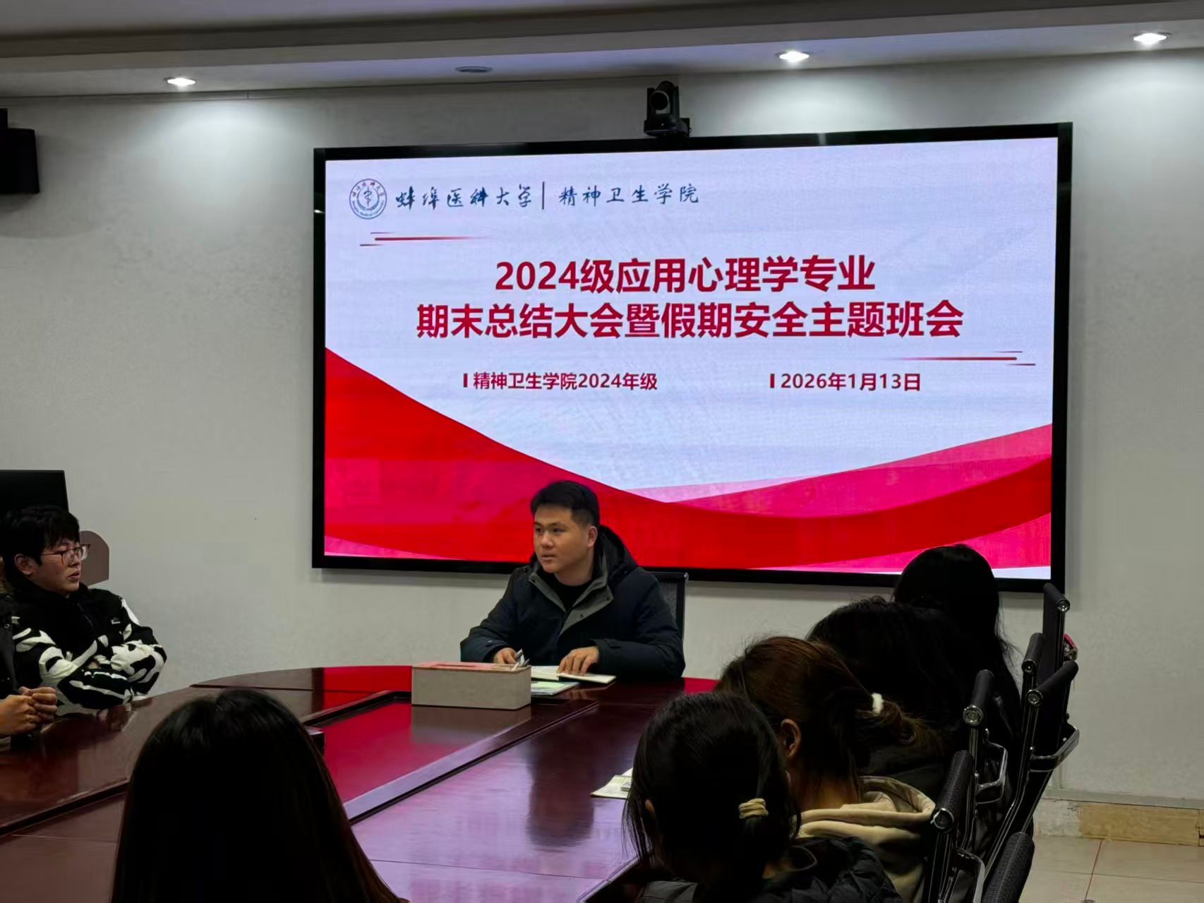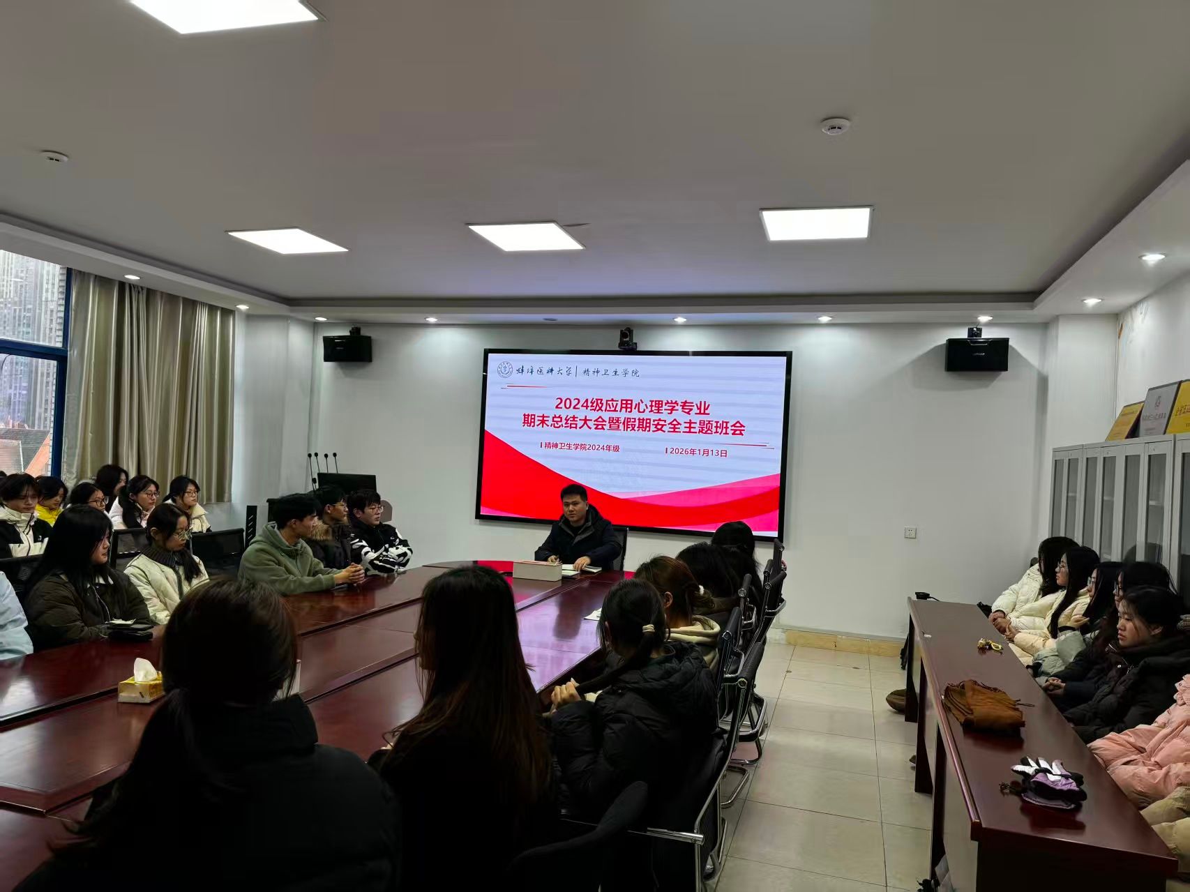为全面总结本学期班级建设成果,深入反思存在问题,明确未来发展方向,1月13日下午,2024级应用心理学专业召开期末总结大会暨假期安全教育班会。会议由年级辅导员张猛主持,全体同学参加。